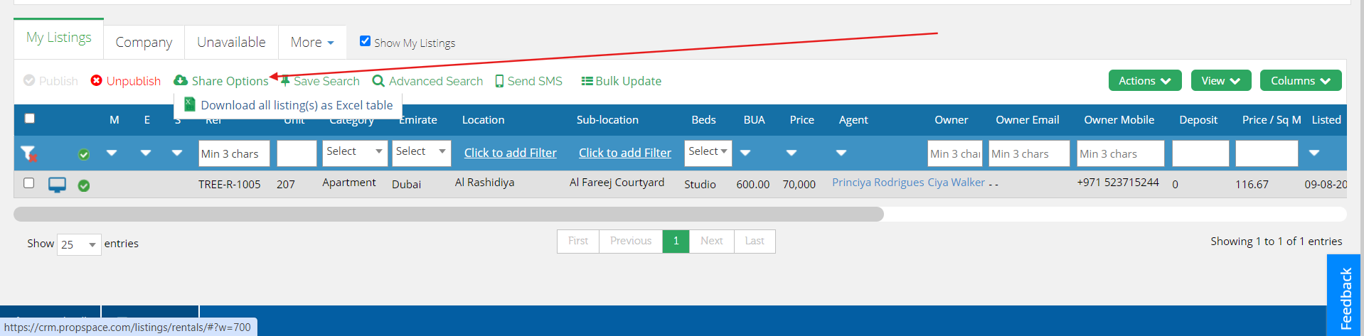 - If you want to download all the listings, you can download all your listings as excel table by clicking on Share Options.
