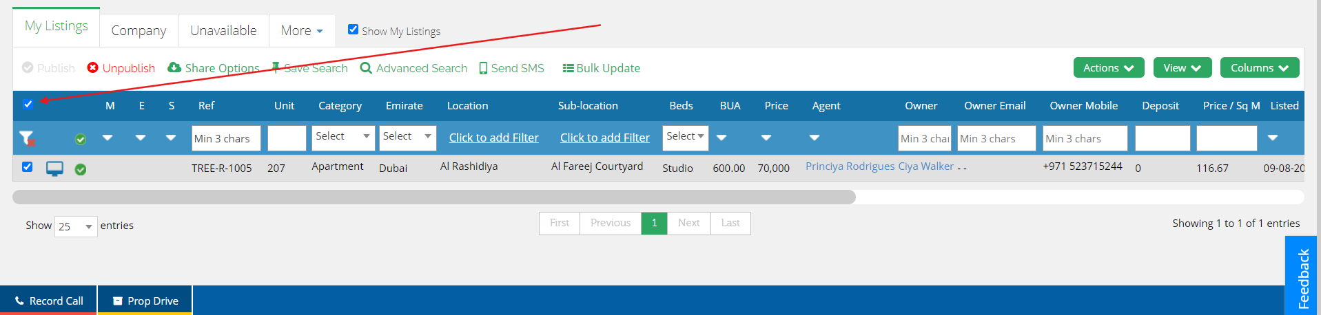- If you want to download all the listings per page, click the select all button. (The entries per page are 10, 25, 50 and 100. The maximum is 100 entries per page.)