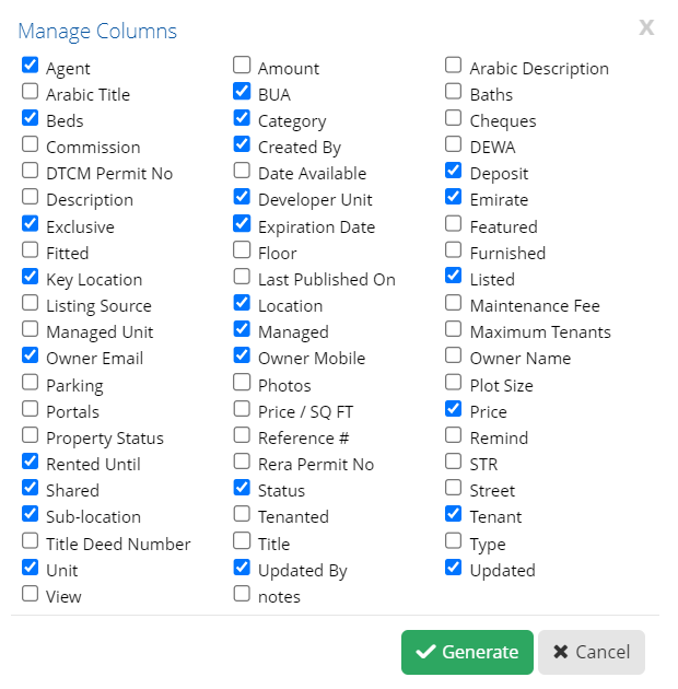 - If you select Download Selected Columns option, you can choose the applicable columns that you want to show on your table. Then click Generate.