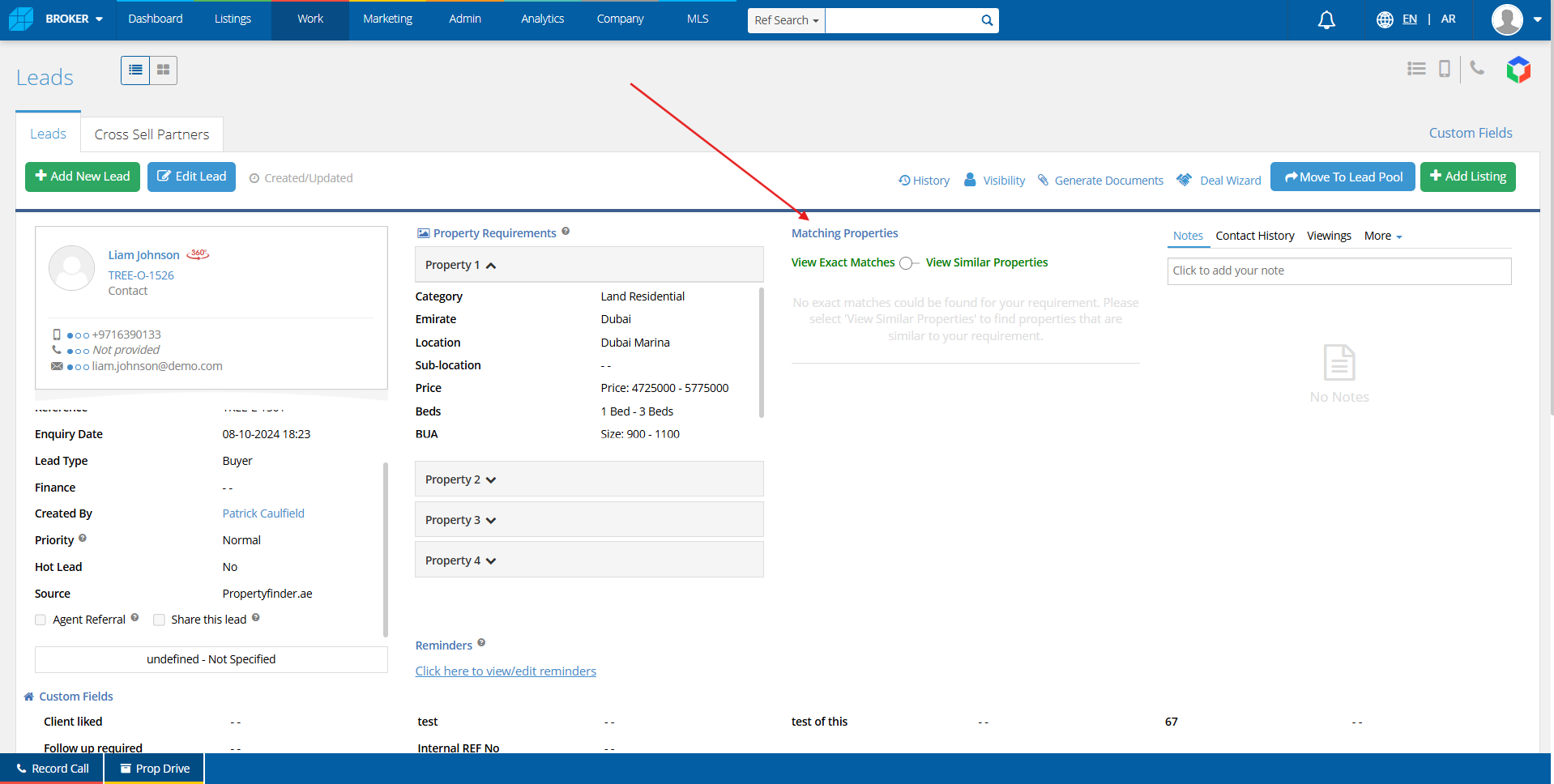 - Click on the 'Matching Properties' switch to quickly find properties that align with your lead's requirements