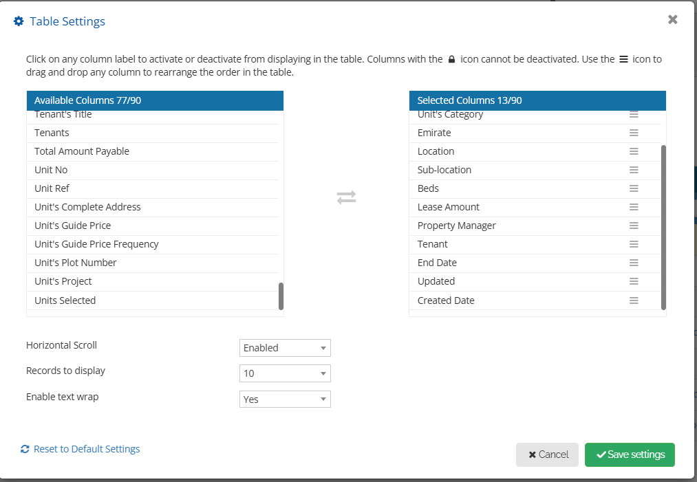 When managing multiple leases, finding a lease for a specific unit can be time-consuming. PropSpace Property Management Software allows you to customize your table settings to include the Unit Number column, making it easier to search for leases by unit number. Follow the steps below to enable and use this feature.