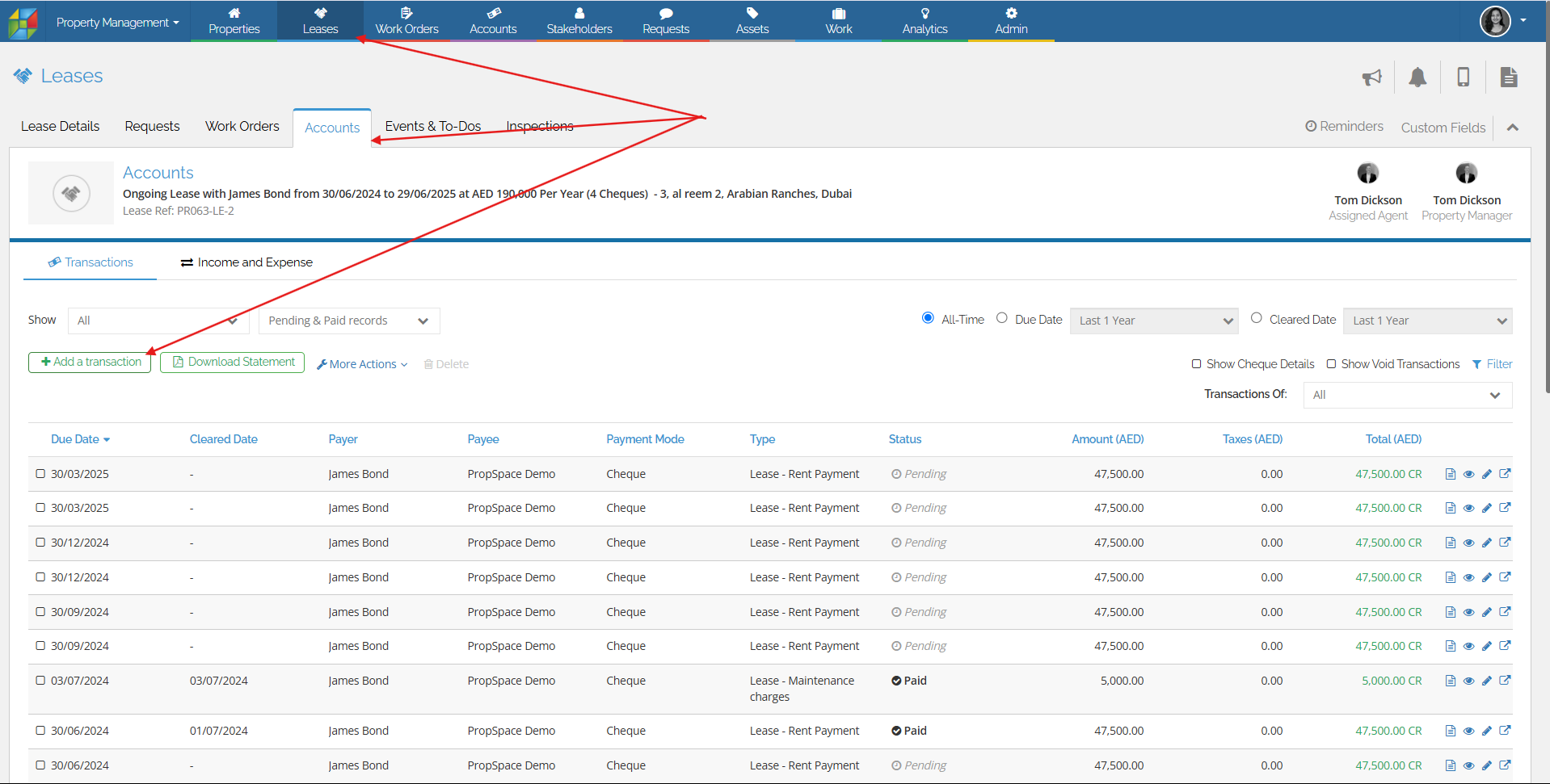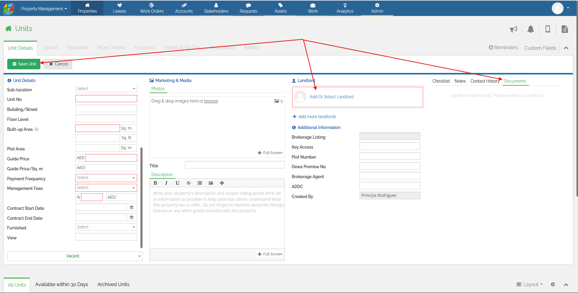 Fill in all required fields, including unit selection, tenant details, and lease terms such as start and end dates, lease amount, payment frequency, and mode.